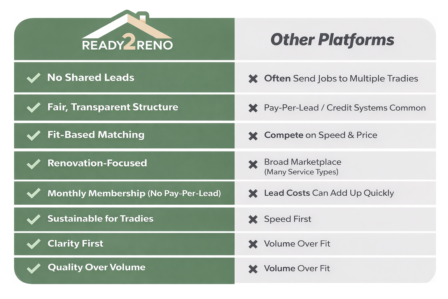 Another major factor in the comparison of Ready 2 Reno vs other renovation platforms is how tradies are charged.